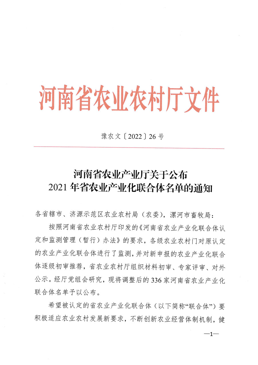 河南省農(nóng)業(yè)農(nóng)村廳關(guān)于公布2021年省農(nóng)業(yè)產(chǎn)業(yè)化聯(lián)合體名單的通知